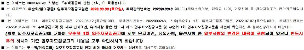 - 본인 및 세대원 중 공고일 현재 재당첨제한 기간 내에 있더라도 청약신청이 가능