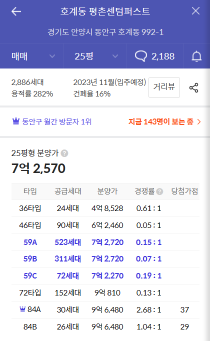 - 평촌 센텀퍼스트 59㎡ 분양가 : 7.27억
