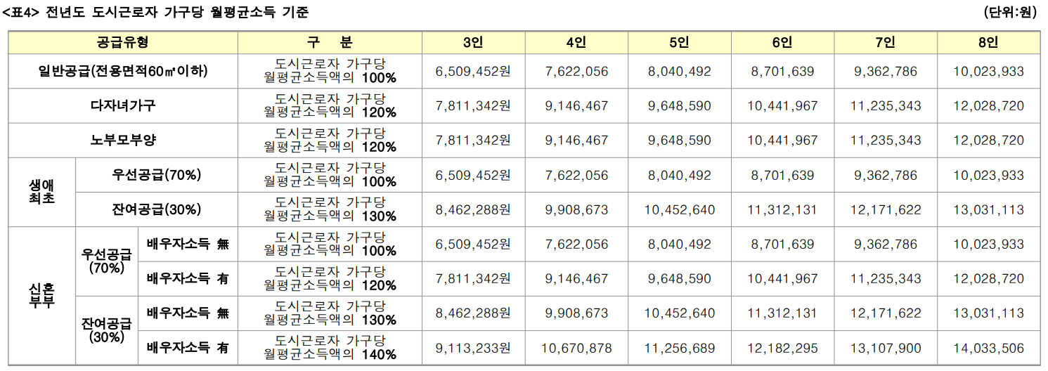 - 자주 헷갈리는 내용인데요. 표가 직전년도(2022년)이구요. 소득은 모집공고일 기준(2023년) 가장 최근 월급을 의미합니다. 즉, 비교할 표는 2022년도, 비교할 소득은 2023년입니다. 급여소득자면, 건강보험공단에서 조회되는 최근 월을 기준으로 합니다. 즉, 5월 소득만 보고, 급여평균을 내지 않습니다.