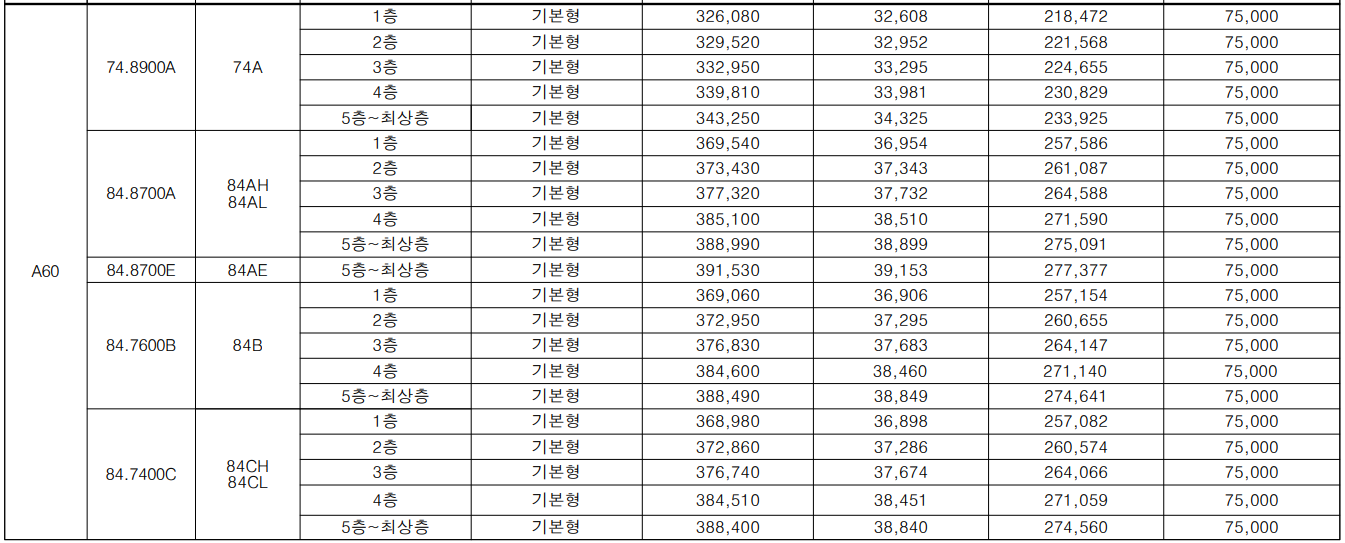 - 84AE타입(44세대 중 40세대) : 3.91억