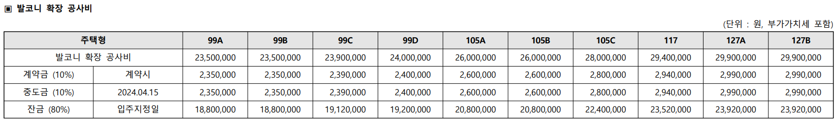 ② 발코니확장비(10%) : 99C(239만원), 99D(240만원), 105A(260만원), 105C(280만원), 117(294만원), 127A/B(299만원)