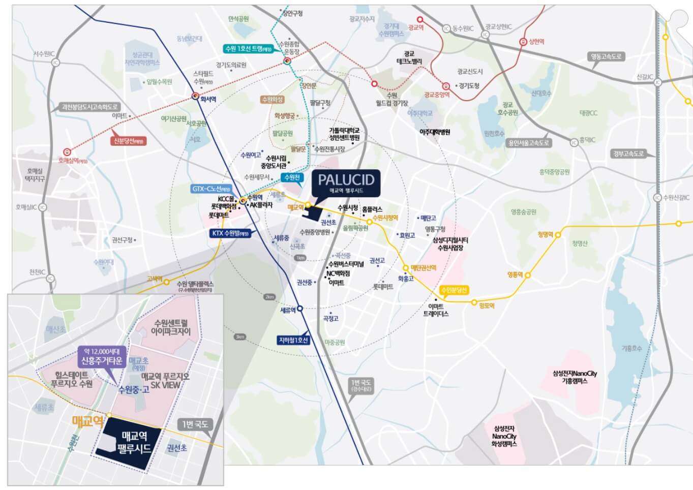 매교역 펠루시드는 대단지로 수인분당선 매교역 초역세권단지입니다. 매교역을 통해 GTX-C 수원역까지는 1정거장이고, 권선초등학교뿐만 아니라 중고등학교도 가까워 장기거주수요가 충분한 곳입니다. 무엇보다도 매교역 팰루시드가 준공되면, 힐스테이트 푸르지오 수원(2586세대, 22년 8월 준공), 매교역푸르지오 SKVIEW(3603세대, 22년 7월 준공), 수원센트럴아이파크자이(3432세대, 23년 7월 준공) 등 11,799세대의 1군 브랜드 타운이 형성될 입주예정입니다. 정비된 대규모 주거단지는 다채로운 상권과 탄탄한 학군이 따라오게 됩니다. 외부환경뿐만 아니라 대단지인만큼 커뮤니티와 조경 역시 기대되는데요. 5000㎡ 규모로 조성될 커뮤니티센터에는 사우나, 체육관, 게스트하우스가 포함되어있고, 조경은 5가지의 테마로 이루어진다고 하네요. 단지명인 팰루시드는 팰리스(궁전)+루시드(빛나는)의 합성어라는데요. 빛나는 궁전으로 다가올 단지인지 살펴보겠습니다.