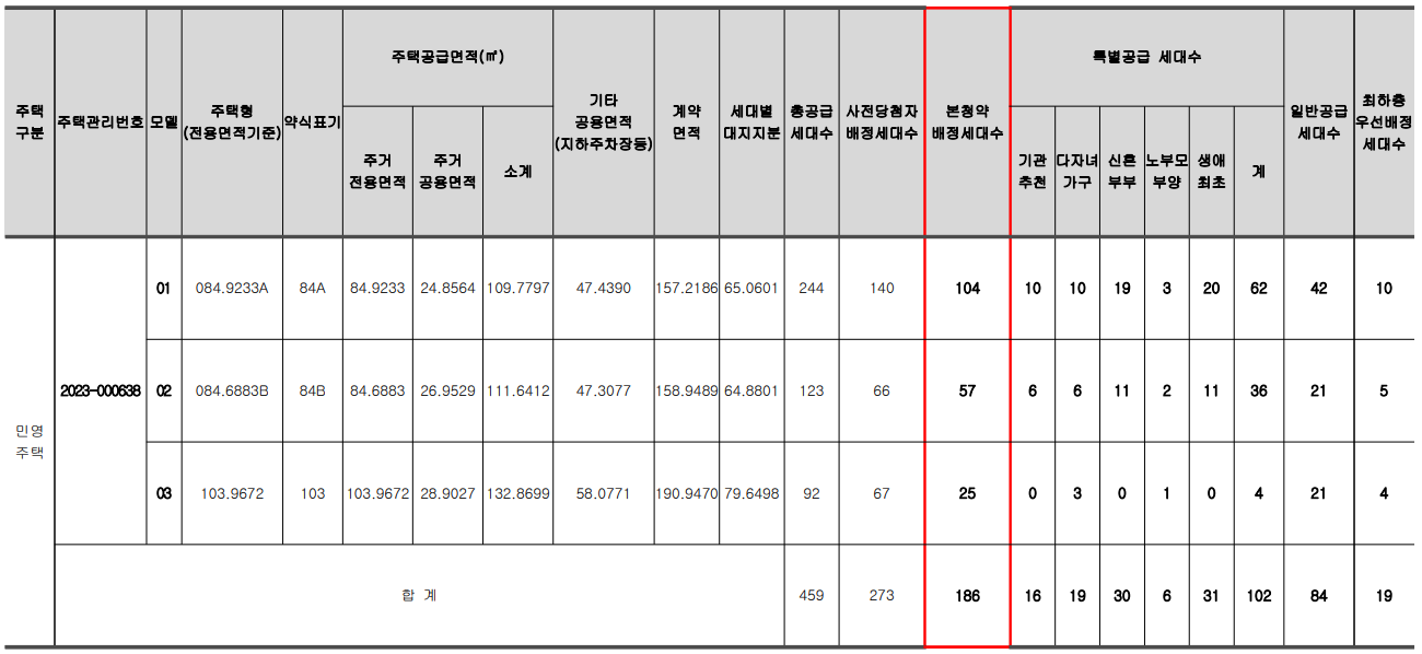 그러고 보니 요새는 민간사전청약을 살펴보기 어렵네요. 사실, 민간사전청약은 큰 의미가 없었습니다. 공공사전청약과 달리 당첨되면 통장을 사용할 수 없게 되어버리다 보니 입지가 좋은 곳이 아니고는 흥행하기 어려웠는데요. 이곳은 아래서 살펴보았듯이 경쟁률이 엄청 났던 곳입니다. 평균경쟁률이 63:1에 달하는데요. 그만큼 좋은 곳이겠죠? 이제 본청약입니다. 사전청약 당첨자가 아닌 분들에게도 186세대가 나왔습니다. 리뷰 시작합니다.