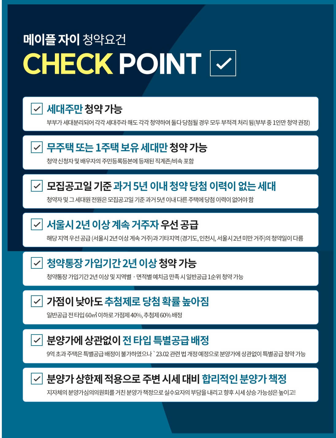 메이플자이는 2023년 7월에 분양했던 용산 호반써밋 에이디션 이후로 2024년에는 처음으로 투기과열지역에서 분양하는 단지입니다. 분양가상한제가 적용되고, 서울 2년이상 거주자에게 우선공급됩니다. 1주택자까지만 지원할 수 있고, 세대주 요건이 있습니다. 중도금대출 50%, 잔금대출 LTV 50%, DSR 40%가 적용됩니다. 그럼, 조금더 알아보겠습니다.
