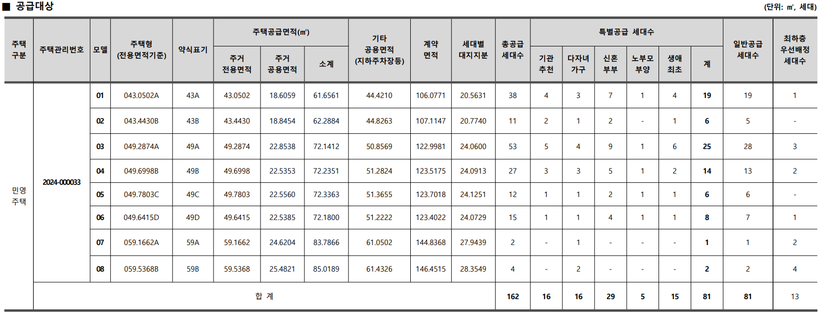 - 전용면적 60㎡ 이하 : 가점제 (40%) 및 추첨제(60%) 적용