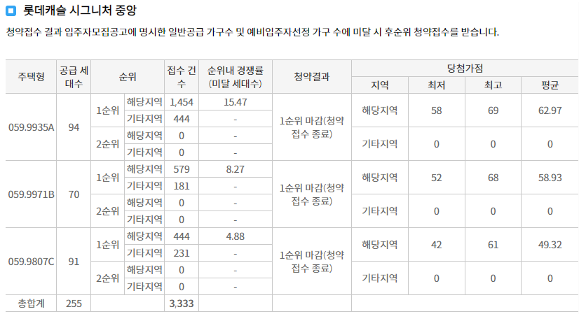 - 전용면적 85㎡ 이하 : 가점제 (40%) 및 추첨제 (60%) 적용