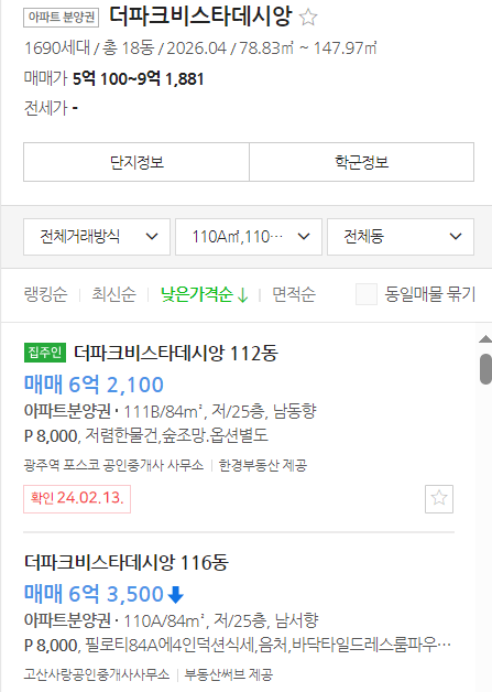 경기광주역 일대에서는 더파크비스타데시앙의 시세를 확인해보는 것을 추천드립니다. 태영건설 부도이슈가 있지만, 프리미엄 8천이 붙어있습니다. 민간공원특례사업으로 중앙공원에 둘러쌓인 단지인데다가 경기광주역까지 가깝기 때문입니다. 광주 실거주하실 분이라면, 프리미엄을 주더라도 더파크비스타데시앙이 더 나아보입니다. 59타입은 5.36억입니다. 이상, 부리남이었습니다.