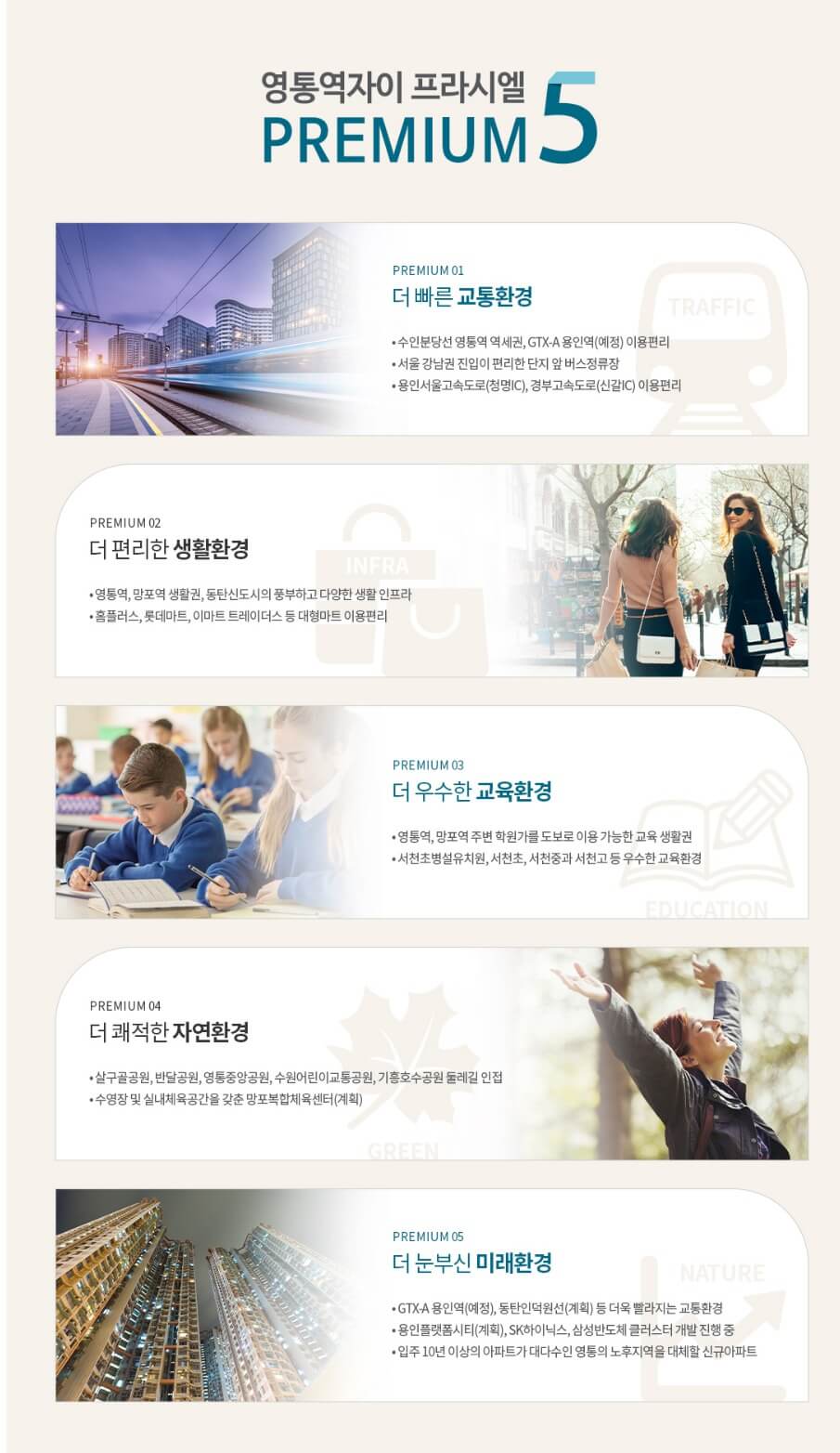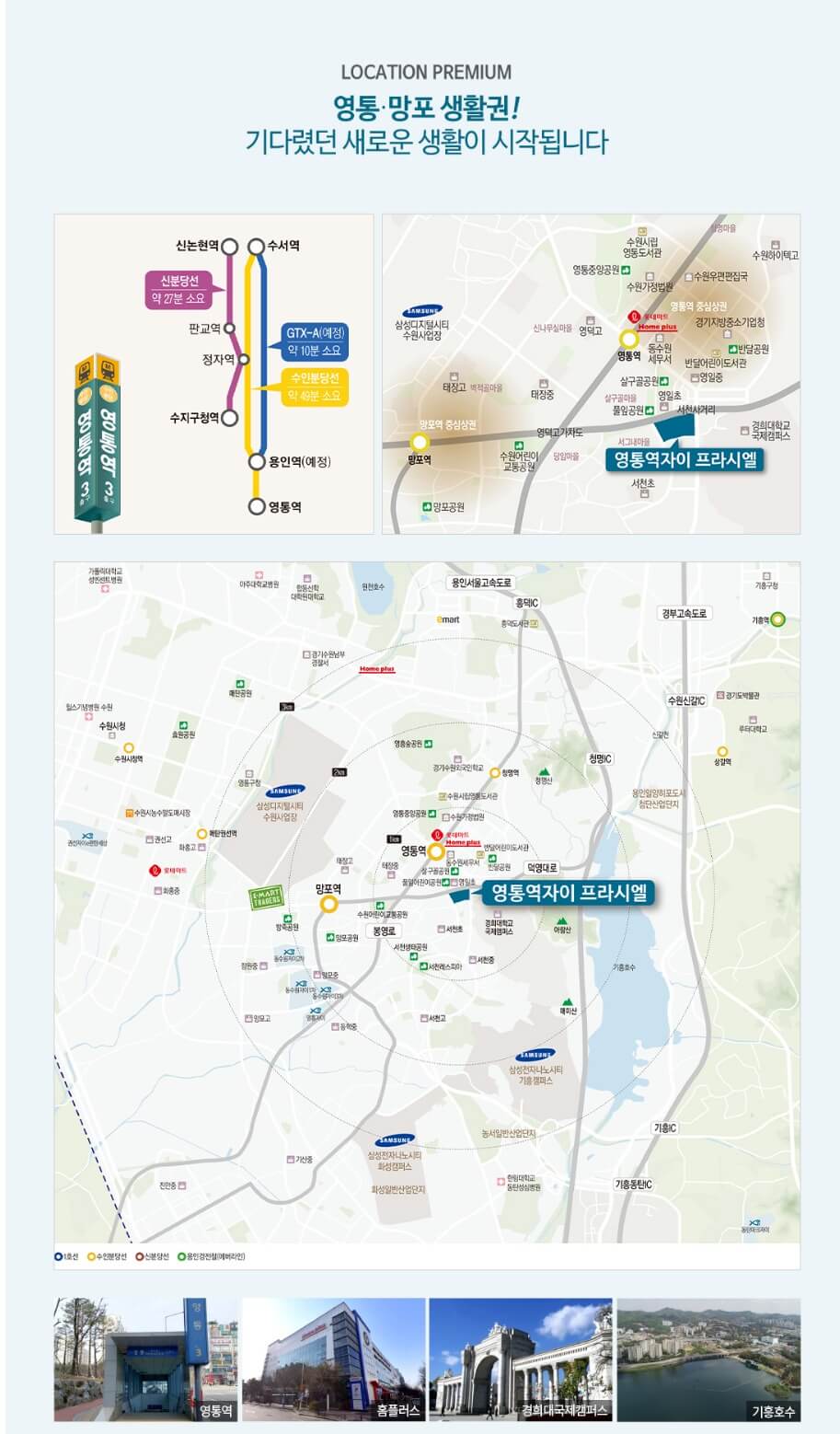 세번째는 단지명처럼 영통역 인프라를 동일하게 이용할수 있다는 점입니다. 아슬아슬하게 역세권 기준에 들어갑니다. 초등학교는 수원이 아니라 용인 주소지라 바로 길건너의 영일초등학교에 배정되지 못한다는 점이 아쉽지만, 도보권은 맞습니다. 학교는 아쉽지만, 영통이 자랑하는 학원가와 상권은 이용할 수 있습니다. 이상, 부동산 리뷰해주는 남자, 부리남이었습니다.