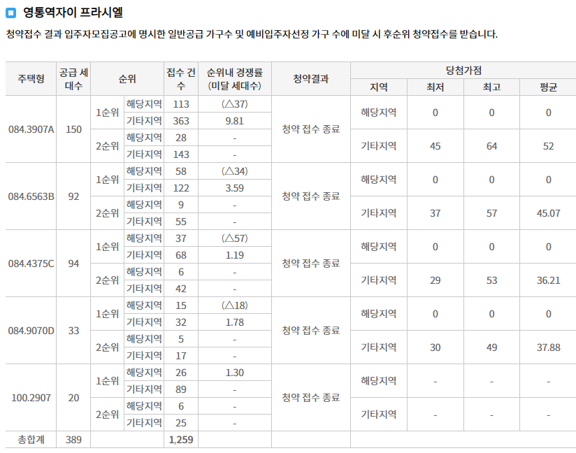 영통역자이 프라시엘은 비교단지의 호가가 오르면서, 안전마진이 일부 생겼습니다. 경쟁률은 높지 않았습니다. 하지만, 세대수가 적은만큼 완판에는 무리가 없어보입니다.