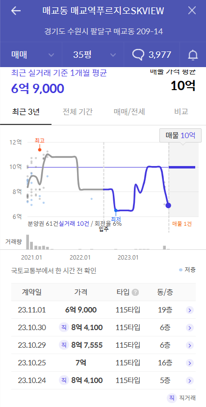 - 매교역푸르지오SK뷰(3603세대, 2022년 7월 준공)은 매교역 팰루시드와 인접한 브랜드 대단지로 세대수가 더 많고, 2024년 개교예정인 매교초등학교와 수원 중고등학교를 품고 있습니다. 브랜드 대단지에 초중고품아, 게다가 역세권인 단지는 수도권에서 보기 힘든데요. 매교역 팰루시드보다 더 나아보입니다. 이를 감안한 비교가치는 9.84억으로 안전마진은 8500만원입니다.