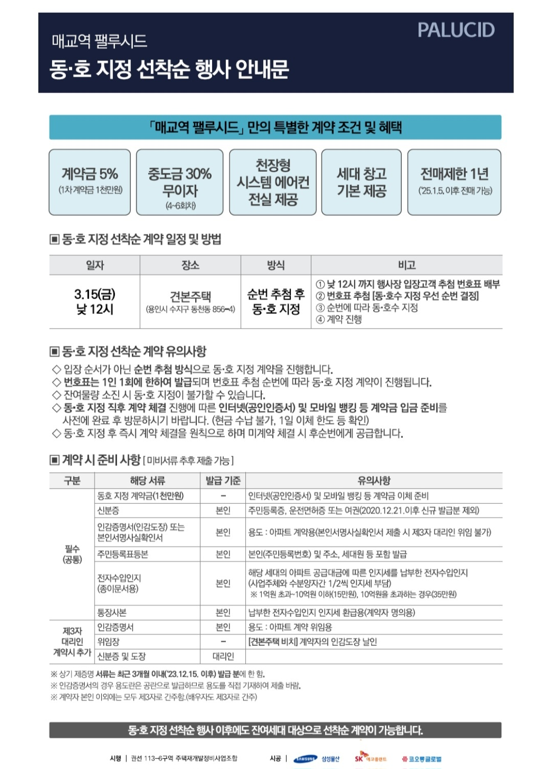 5) 대리인 추첨 및 계약 시(추가) : 위임장(견본주택 내 비치), 인감증명서(위임용) 1부, 대리인 신분증 및 도장