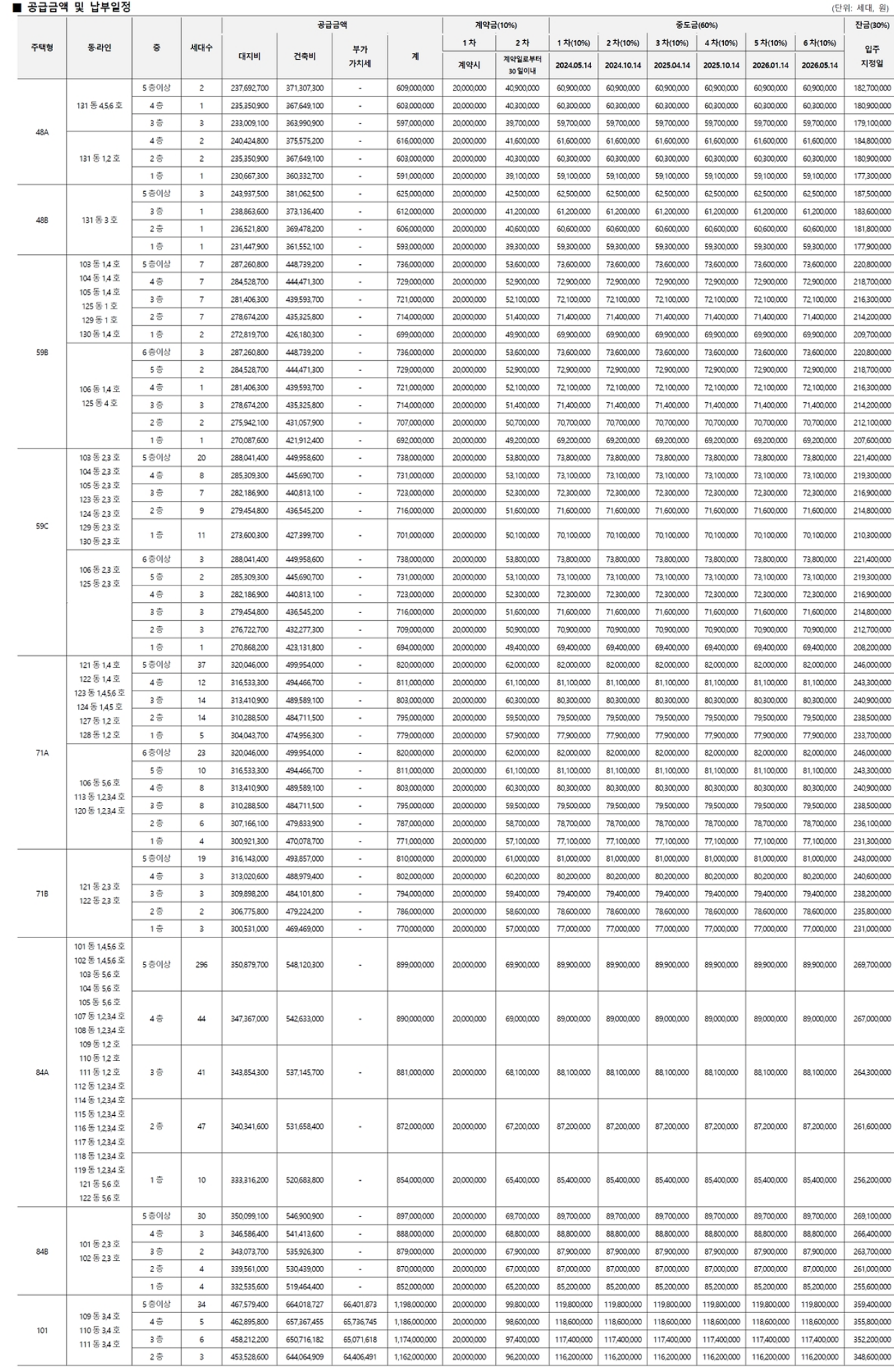 - 71B타입(45세대 중 30세대) : 8.10억/최고 15층