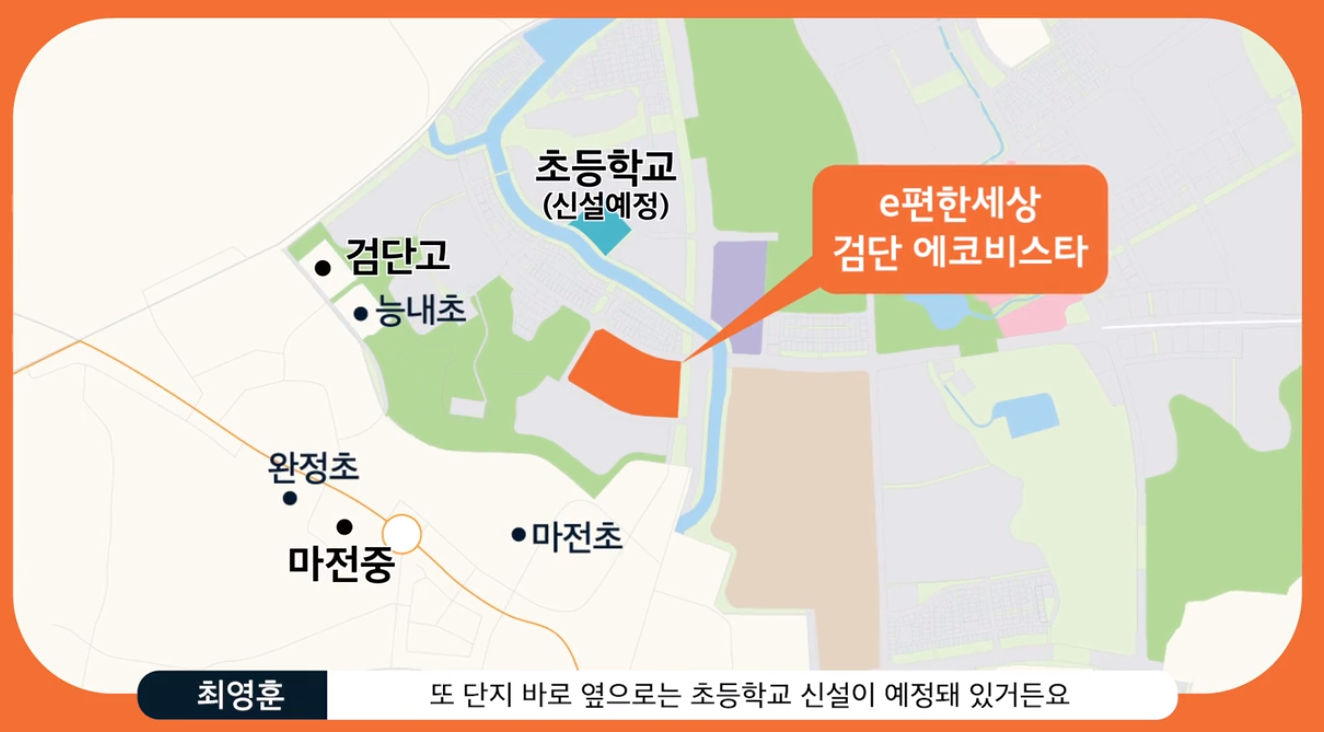 e편한세상 검단 에코비스타 AA29BL은 안전마진도 부족하고 입지도 아쉽습니다. 호재가 많은 103역까지는 1.2km 떨어져있습니다. 검단의 중심 인프라들과도 거리가 있습니다. 특히, 신도시는 신설초등학교에 아이들을 보내려는 수요가 있는데요. 초등학교는 400m내외의 신설초등학교로 가게되지만, 중고등학교는 구도심의 마전중과 검단고등학교를 언급하고 있습니다.