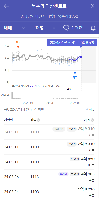 - 더샵 센트로는 준공된 단지로 호가를 확인할 수 있습니다. 잔여세대와 비교매물은 동일한 조건으로 직접비교가 가능합니다. 최근 실거래가가 분양권이라는 점에서 호가는 과하지 않은데요. 안전마진은 8700만원입니다.