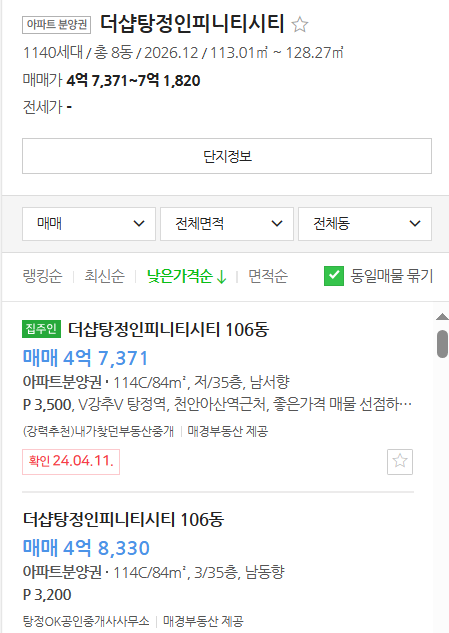 - 더샵 탕정인피니티시티 2차 84㎡ 분양가 : 4.90억