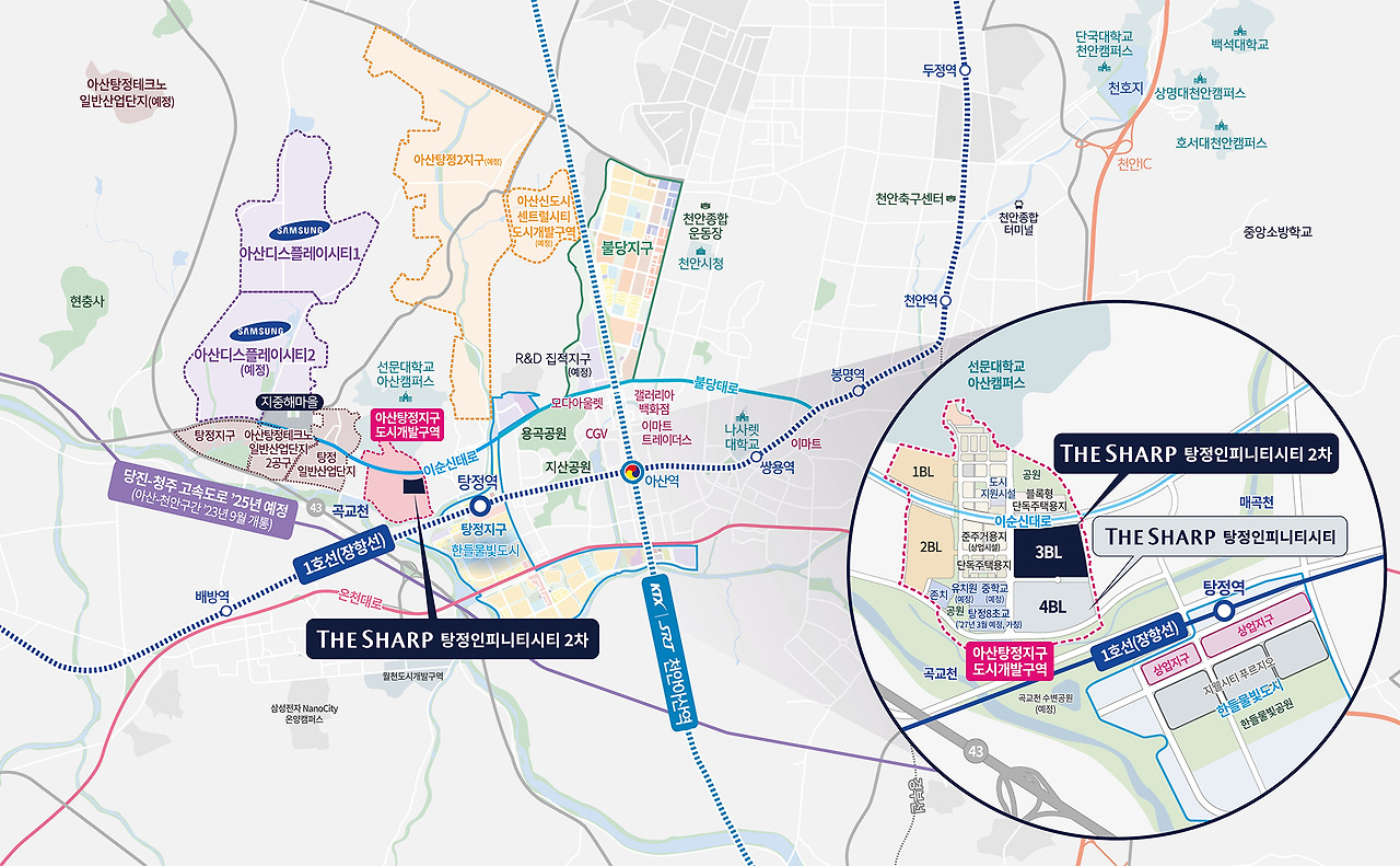 더샵 탕정인피니티시티 2차는 아산탕정지구 도시개발구역에 공급되는 두번째 단지입니다. 지난 1차가 첫번째였는데요. 1호선 탕정역과 지구내 유초중학교가 모두 가깝습니다. 북쪽으로는 일반산업단지와 삼성디스플레이가 있어 출퇴근도 용이합니다.