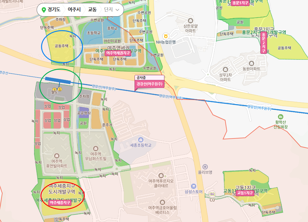 여주역(초록색 원)을 중심으로 여주역자이헤리티지(빨간색원)의 경쟁자는 위의 공동주택(파란색원)입니다. 역과 더 가깝고 초등학교와 중학교가 가깝기 때문인데요. 새롭게 분양할 곳인가 살펴보았는데, 여주역LH3단지로 2023년 5월 준공된 행복주택입니다. 결국, 앞으로 경쟁할 단지는 없다는 얘기입니다.