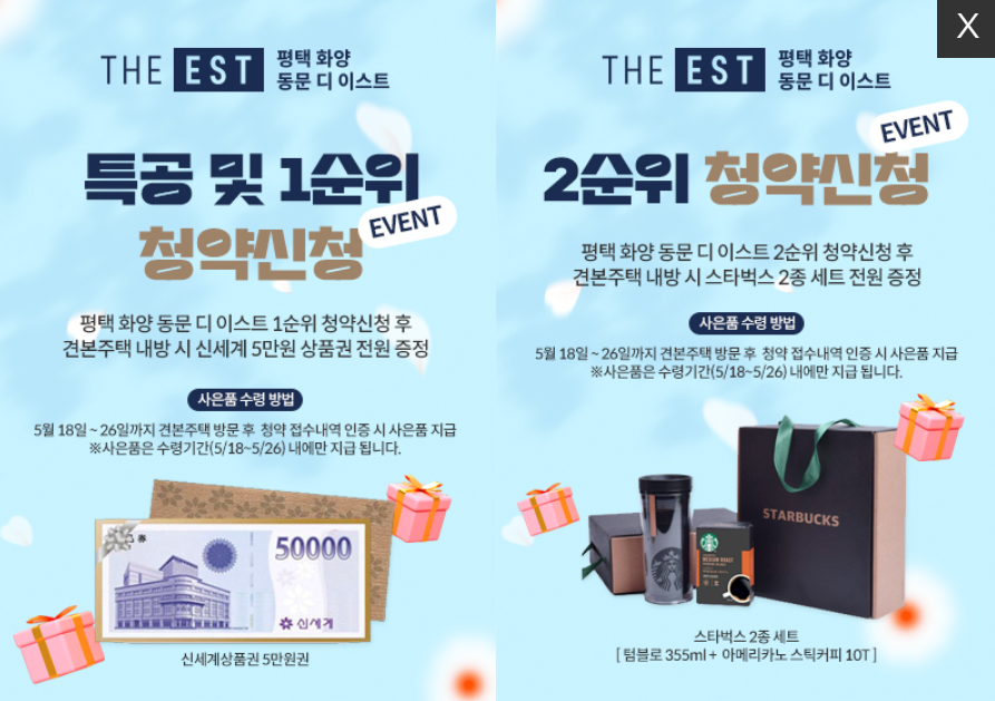 화양지구는 서평택의 84만평에 2만세대가 계획되어 있고, 이제 대부분의 단지들이 분양을 끝냈습니다. 평택 화양 동문 디 이스트는 상품성이 좋고, 분양가가 낮아도 좋은 성적을 내기가 어렵습니다. 물량이 많고, 호재에서도 벗어나고, 분위기가 그렇습니다. 유인책으로 특공과 1순위 청약시에는 상품권 5만원, 2순위 청약시에는 스타벅스 2종 세트를 전원 증정한다고 합니다. 상품만 봤을 때는 '에게~'했다가, '전원'이라는 말에 '오'하고 진심이 느껴집니다. 1000명이 1순위에 청약해도 5천만원이니까요. 하지만, 최근 분양했던 서희스타힐스2차의 1순위 접수통장은 11개였습니다.