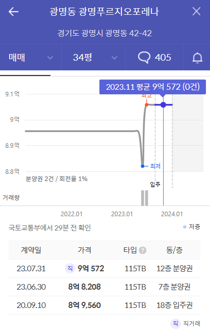 - 광명푸르지오포레나(2023년 9월준공, 1187세대)를 비교 단지로 잡았습니다. 최근 입주를 완료한 단지로 7호선 광명사거리역과의 거리는 조금더 가깝고, 초등학교와의 거리는 조금더 먼 단지입니다. 입주장으로 상대적으로 호가는 낮은 편인 점을 감안한 비교가치는 11.02억으로 안전마진은 없습니다.