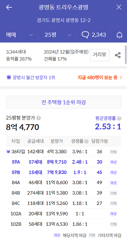 - 트리우스 광명 84㎡ 분양가 : 11.53억