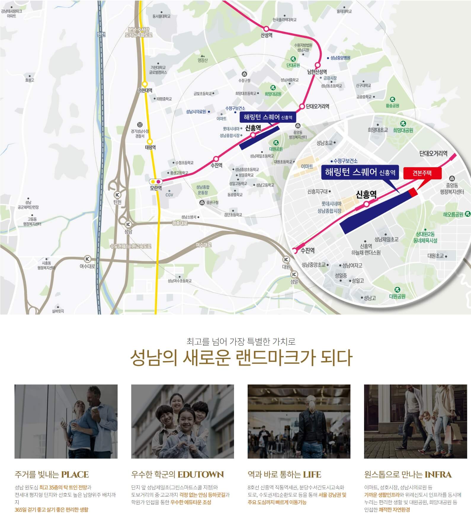 해링턴 스퀘어 신흥역은 신흥역 코오롱하늘채 랜더스원을 통해서 이미 한번 소개되었던 곳입니다. 신흥역에 딱 붙어서 길게 뻗어있는 성남중1구역은 오래 전부터 분양나오면 꼭 넣는다고 노리던 입지인데요. 초역세권을 떠나 단지와 직통연결되고, 35층 대단지로 멋지게 올라갑니다. 초등학교도 랜더스원이 품고있는 제일초등학교로 배정되기때문에 안전한 등하원이 될 것으로 보이는데요. 교통, 학군, 그리고 이미 형성된 학군과 공원까지 4박자가 잘 갖춰진 단지입니다. 그럼, 조금 더 알아보겠습니다.