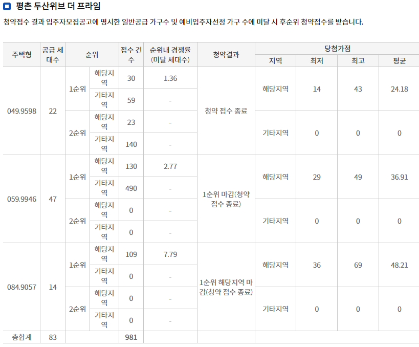 - 전용면적 85㎡ 이하 : 가점제 (40%) 및 추첨제(60%) 적용