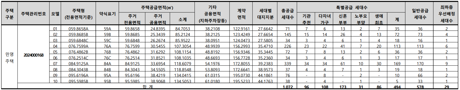 - 전용면적 85㎡ 초과 : 추첨제(100%) 적용