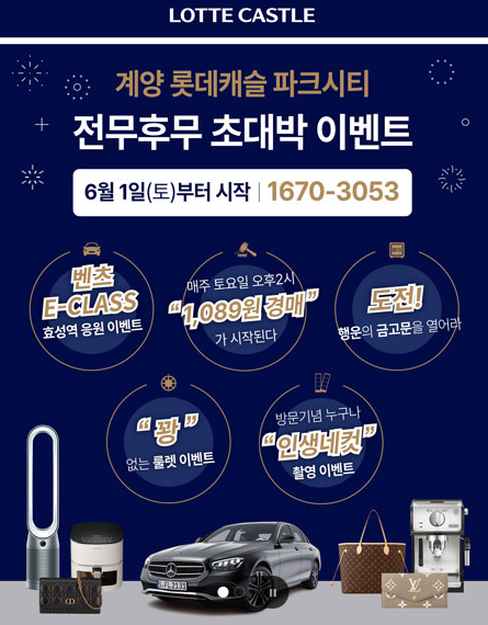 계양 롯데캐슬 파크시티 2단지는 입지도 좋지 않고, 안전마진도 없습니다. 문제는 대안도 많다는 것입니다. 작전역 초역세권 힐스테이트자이계양 59타입 16층은 5.7억, 가정역 초역세권 루원시티SK리더스뷰 84타입 저층이 6.9억입니다. 실수요자들은 두 단지를 우선적으로 고려하셨으면 좋겠고요. 투자자들은 곧 나올 북변 우미린(전매제한 6개월)이나 오산 한신더휴(분상제) 줍줍에 참여하시는 것을 추천드립니다. 지금 계양 롯데캐슬 파크시티를 잡는 것보다는 2곳이 더 좋습니다. RR을 잡는다고 해도, 2023년 9월 분양했던 제일풍경채 계양 위너스카이가 7800만원 더 저렴합니다. 2025년 8월 준공되어 물량이 소진될 때까지는 단타로 매도하기는 쉽지 않아보입니다. 아래처럼 이벤트가 진행 중이니, 이벤트 정도만 참여해보시고 계약까지는 신중하시기 바랍니다. 이상, 부동산 리뷰해주는 남자, 부리남이었습니다.