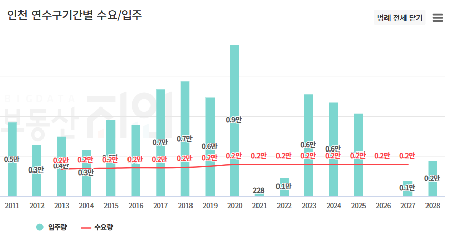 송도는 입주물량이 많은 구간에 있습니다. 특히, 오션뷰로 대표되는 3개의 대단지가 입주를 앞두고 있고, 이들의 시세가 송도의 시세를 한층더 올려줄 것입니다. 송도자이더스타(2024년 12월 준공, 8.03억, 2/44층, 마피4000), 송도자이크리스탈오션(2024년 6월 준공, 8/42층, 8.8억, 사이바다뷰, 피1.2억), 송도럭스오션sk뷰(2025년 3월 준공, 8.12억, 마피5000)으로 최저호가는 대부분 8억대로 형성되어 있습니다. 마피라 기회일 수 있으나, 계약금 20%이거나, 중도금대출 50%였던 시절의 분양이라, 매수자의 초기부담이 큰 편입니다. 오히려, 조금더 기다렸다가 입주장에 매수기회를 노려봐도 좋을 것으로 보입니다. 최근 송도자이크리스탈오션의 사전점검으로 기대감은 남아있는 곳들입니다.