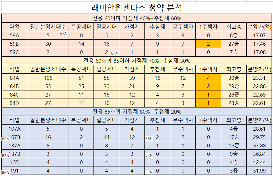 더 인상적인 것은 동호수배치도입니다. 조합원들이 59타입과 대형평형을 가져가고, 84타입을 일반분양으로 남겨놓았는데요. 최고층수까지도 허용했다는 것입니다. 물론, 분양가도 타단지 대비 층수별 분양가를 세분화하여 받을 건 받습니다. 반대로 얘기하면, 저층에 당첨되어도 실망할 필요가 없다는 것입니다. 그만큼 분양가가 저렴하니까요. 이번 분양에서 경쟁률은 못난이 타입이 아니라 비쌀수록 경쟁률이 낮은 아주 당연하고 당연한 결과가 나올 것으로 보입니다. 틈새가 보이지 않습니다. 저가점자에게 유일한 방법은 특공뿐이고, 일반공급자들은 배우자의 통장 보유기간 합산이 용이할 것입니다. 결국, 당해마감이니 서울 거주자 2년이상이신 분들에게만 의미있는 청약이 되겠네요. 오늘도 부리남이었습니다.