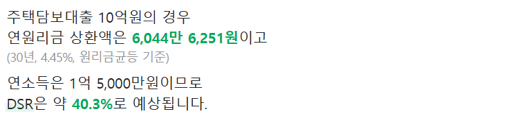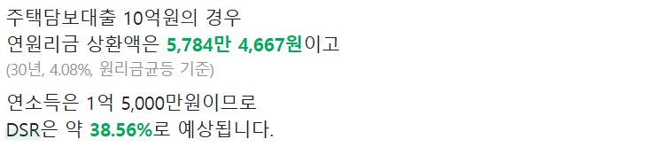 또, 한가지 주의할 점은 스트레스 DSR입니다. 2024년 기준 가산금리가 0.38%에서 0.75%로 늘어납니다. 2024년 7월 9일 기준 신잔액코픽스 금리 3.2%인데요. 여기에 가산금리 0.5%를 가정한다면, 금리는 4.08%에서 4.45%로 늘어납니다. 부부합산 연봉 1.5억으로 10억을 대출받는다면, 아래와 같이 DSR변화가 생깁니다.