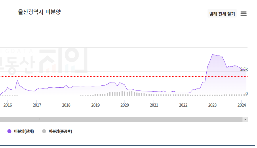 울산의 입주물량은 아래와 같이 양호합니다. 하지만, 미분양이 많은 것이 부담입니다. 라엘에스는 2028년 2월 준공이고, 전매제한 6개월입니다. 분양가 부담으로 실거주자뿐만 아니라 투자자의 손길을 타야하는 단지인데요. 미분양이 많은 상황에서는 쉽지 않습니다.