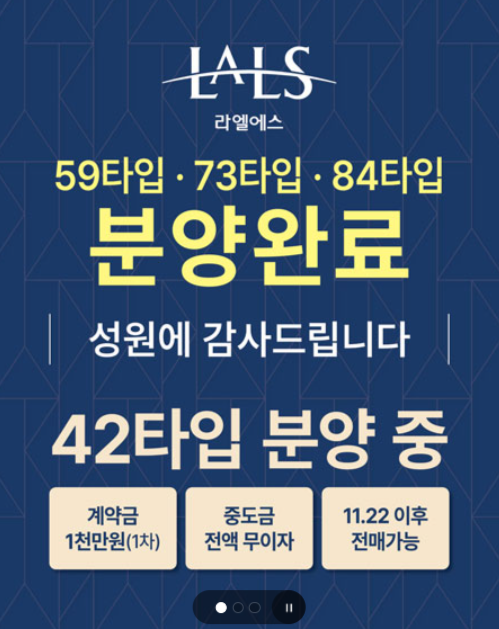 라엘에스는 42타입만 남아 완판을 앞두고 있습니다. 42타입은 공급자체가 13세대뿐이어서 소진에는 문제가 없겠습니다. 굳이 아쉬운 점이라면, 커뮤니티와 조경이 좋은 1단지가 아니라 2단지에만 있어 선택의 여지가 없다는 것일 겁니다. 일반적으로 지방투자에서는 84타입이상을 추천드립니다. 수도권 대비 집값이 저렴해 소형평형은 매수수요가 크지 않습니다. 하지만, 완판된 신축이고, 공급자체가 적은 곳이라면 고려해볼만합니다.