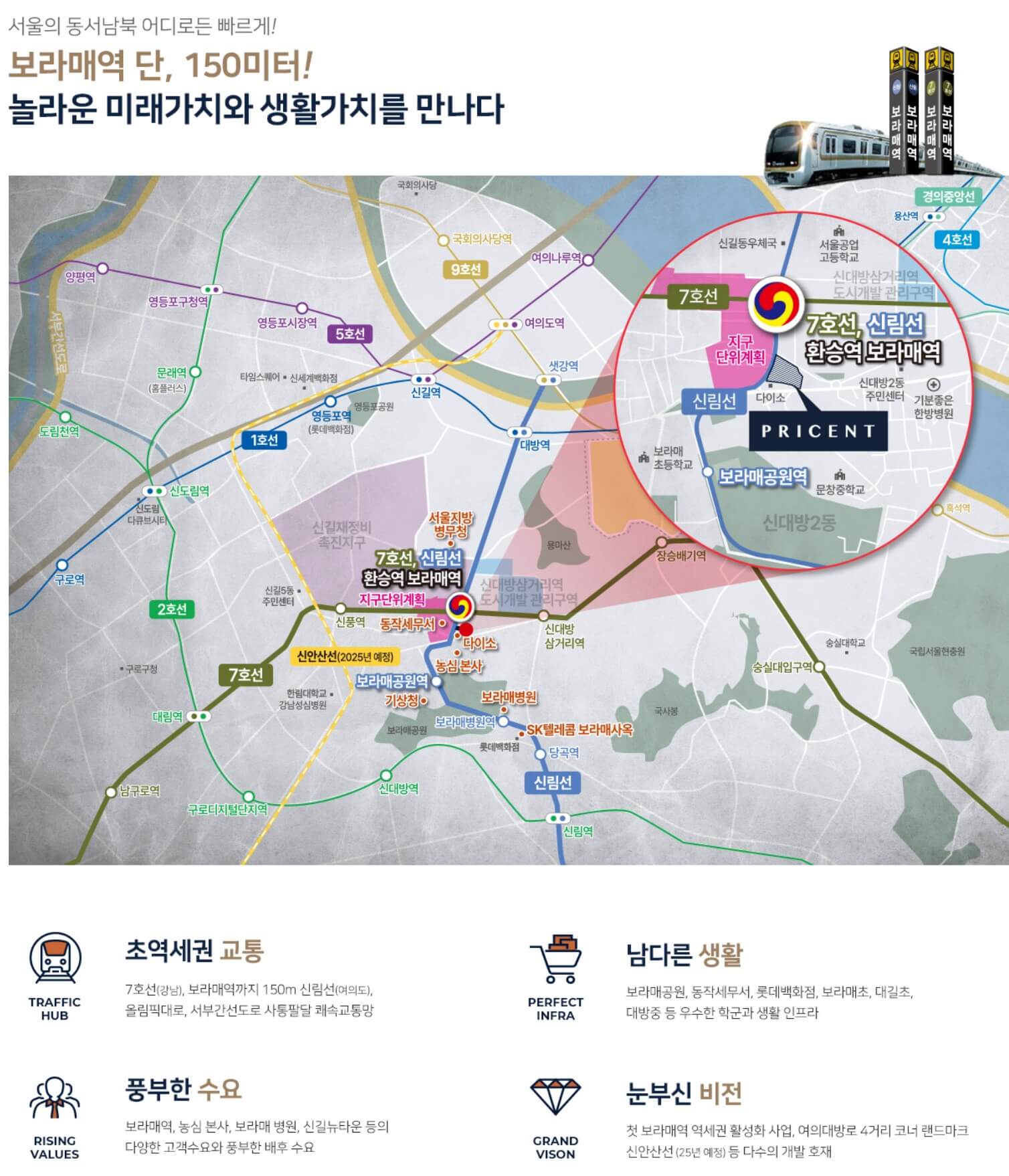동작 보라매역 프리센트는 보라매역세권 활성화 사업으로 공급되는 단지입니다. 아래 기사와 달리 준공은 2026년 10월이고요. 용도지역을 상향하고 공공기여시설을 입점시키는데요. 4층에 청년창업지원시설과 보건지소 등이 예정되어있다고 합니다. 1-3층은 상업시설이고요. 결국, 동작 보라매역 프리센트는 5층부터 분양을 하는데요. 역세권 개발이 붙을만큼, 역에서 상당히 가깝습니다. 기존 가로축으로만 이동이 가능했던 7호선 생활권에 신림선이 개통하면서 세로축으로 여의도 접근이 가능해져 보라매역의 가치는 더 올랐는데요. 어떤 단지인지 알아보겠습니다.