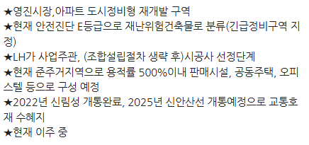 최초 리뷰를 하면서 관심이 가는 매물은 영진 아파트였는데요. 신길뉴타운의 대장이라 불리는 래미안 에스티움 바로 왼쪽에 인접하였고, LH공공주도의 도시재생형정비사업이 진행중입니다. 보통은 네이버부동산에 '재개발' 필터링하면 나오는데, 여기는 특이하게도 나오지 않는 단지입니다. 그리고, 재개발이 추진중임에도 3.3억 매물이 있습니다. 아래 블로그에도 자세한 현황이 소개되었지만, 시공사 선정단계임에도 노후화가 심해 대부분의 주민들이 이주했다고 하는데요. 해당 매물 정보가 맞다면, 주택담보대출 LTV 70%를 받아, 1.05억+@(취득세)로 소액투자가 가능하지 않을까 관심을 가져보았습니다. 정보가 많지 않으므로, 관심있으신 분들은 현장 확인해보시고, 공인중개사분과 통화해보시기 바랍니다. 이상, 부동산 리뷰해주는 남자, 부리남이었습니다.