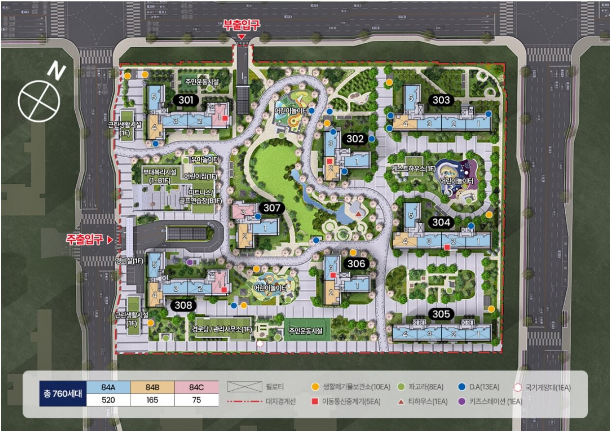 수도권 거주자 모두 신청 가능하고, 전부 84타입이라 실수요자분들에게 좋은 단지인데요. 장항지구의 단점은 교통입니다. GTX나 3호선과 가깝지 않습니다. 고양 장항 아테라는 위에서 언급했듯이 저렴한 분양가를 제외하고는 특별히 끌리는 포인트(뷰, 역세권, 초고층, 상권, 호재)가 없는 단지입니다. 단지배치도와 평면도가 나오면 다시 한번 다루어보도록 하겠습니다. 단지배치도와 평면도가 업데이트 되어 다시 다루어봅니다(2024년 7월 26일 21:00 업데이트) 택지지구답게 시원시원하게 뽑았습니다. 업데이트하기 전에 래미안 레벤투스를 먼저 보고 왔더니, 비교가 되면서 속이 뻥 뚫립니다. 정비사업과 택지지구의 차이입니다. 고양 장항 아테라는 타워형이고, 84C가 못난이 타입입니다. 301동, 308동 기준으로 거실은 남향이지만, 나머지방들이 서향입니다.