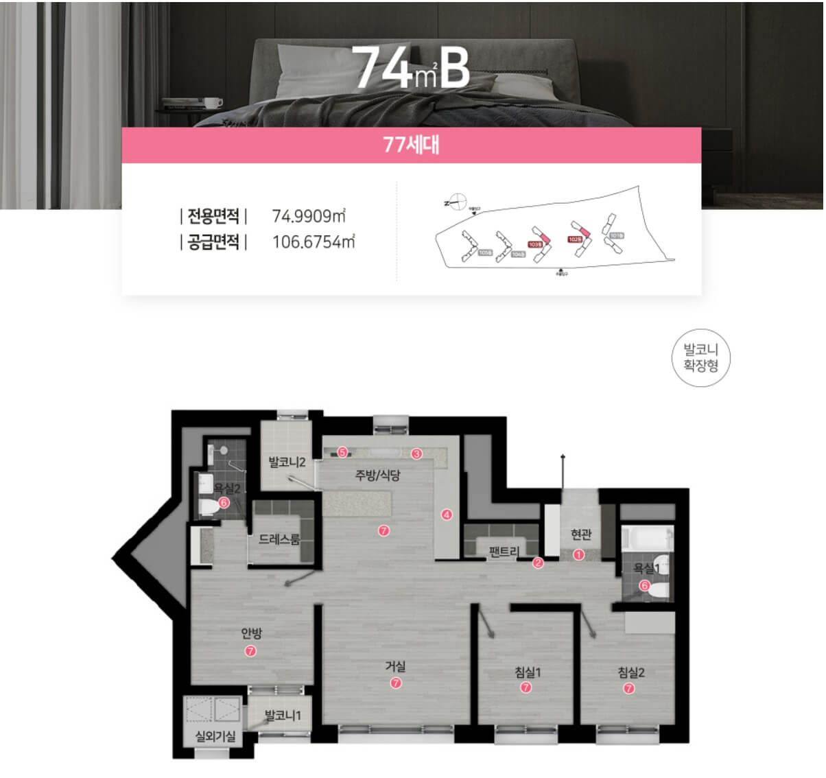 - 74B㎡(77세대 중 3세대) : 5.62억