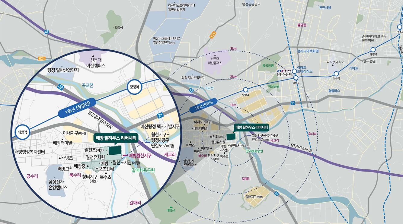 월천지구 중심에 배방 필하우스 리버시티가 분양했습니다. 지구자체는 지하철역이 지나가지 않아 매력은 덜하지만, 탕정지구의 훈풍의 곁바람을 쐴 수 있는 곳이라 관심을 가졌는데요. 무려 1083세대였습니다. 이 단지는 알박기로 소송전이 계속되면서 분양이 늦어졌는데요. 그래서, 월천지구 한가운데가 오랫동안 뻥 뚫려있었습니다. 최근 계약 조건도 변경되어서 다시 한번 소개드립니다.