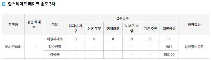 힐스테이트 레이크 송도3차 계약취소 줍줍의 결과는 561명이 접수하는 것으로 끝났습니다.