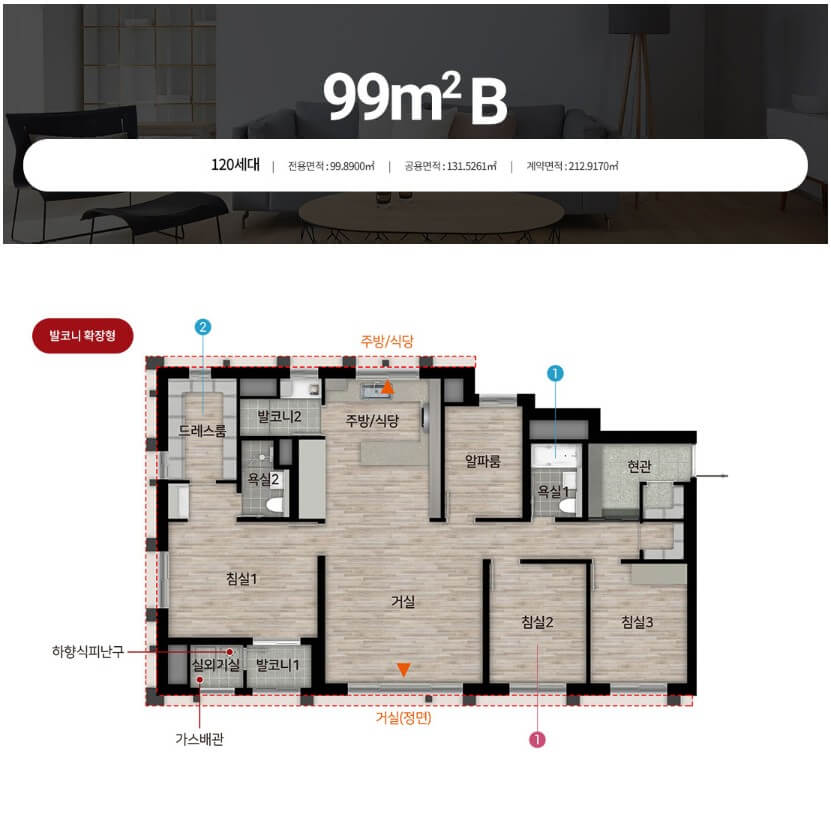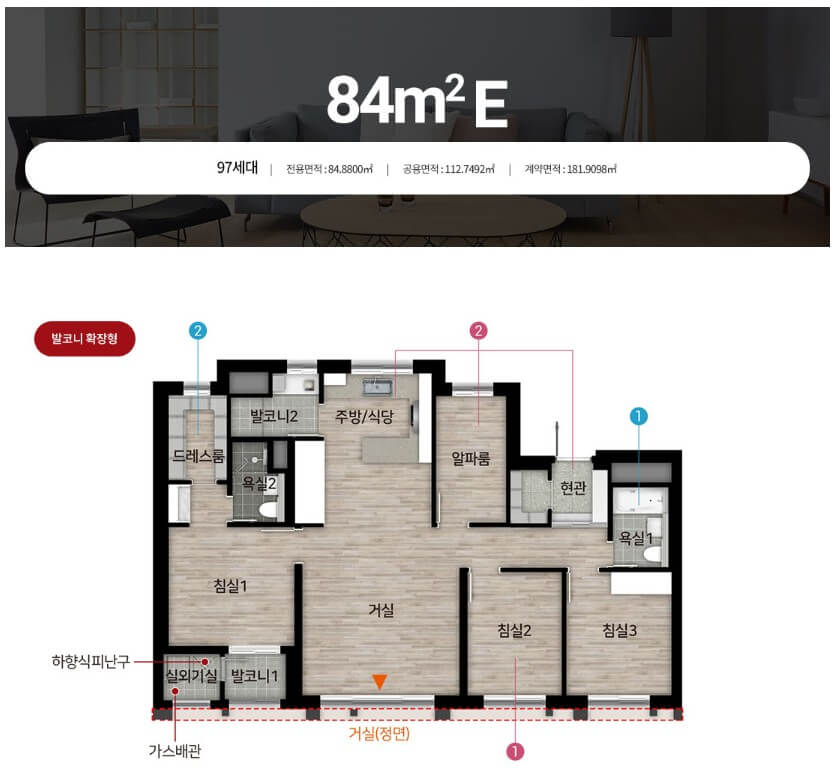 - 84D㎡(1세대, 307동 1302호) : 7.52억