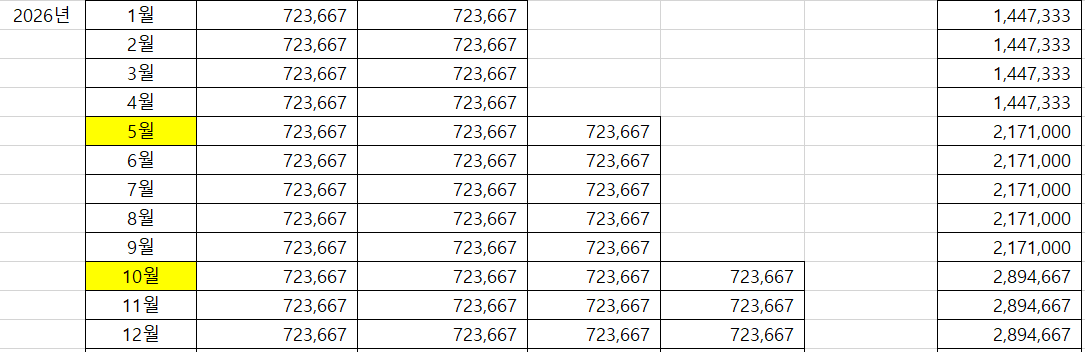 마지막으로, 중도금대출이자입니다. 어김없이 이번에도 이자 직접 납부 방식입니다. 중도금대출은 50%를 받을 수 있고, 나머지 10%는 자납해야합니다. 준공까지 기간이 길어, 총 납부해야할 이자만 8466만원입니다. 한달마다 평균 201만원을 납부해야합니다. 최대 361만원까지 납부할 여력이 되어야합니다. 즉, 분양가 외에도 이자 8466만원+자납 10%인 2.17억의 합인 3.1억을 추가로 확보해야합니다.