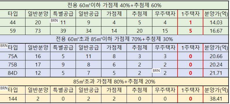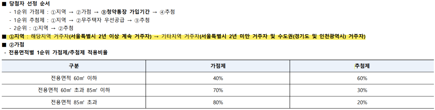 - 전용면적 60㎡ 이하 : 가점제 (40%) 및 추첨제(60%) 적용