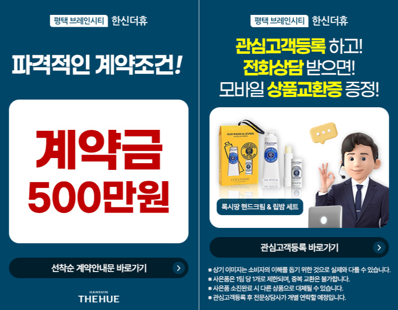 최근 소개드렸던 한신더휴와 세대수, 브랜드 상품성이 비슷합니다. 하지만, 한신 더휴가 초품아이고 아주대병원이 옆이라 입지적으로 조금 더 좋습니다. 그리고, 가장 선착순에 적극적인 단지도 한신더휴네요. 전화상담받으면, 록시땅 핸드크림 준답니다. 대신, 당분간 전화 많이 받으실거에요. 이건 정말 하실 분들만 하세요. 계약금 500만원은 1차 계약금 얘기입니다. 결국, 계약금은 5%내야합니다.
