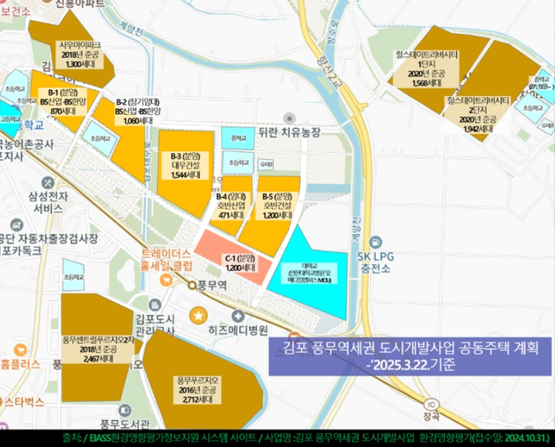 위의 기사처럼 '찐' 풍무역세권 아파트를 기다리시는 것을 추천드립니다. 2025년 9월 푸르지오가 B3블록에 1500세대를 공급합니다. 이후에도 수자인이 B1블록에 640세대, B2블록에 999세대를 하반기에 분양할 예정입니다. 이외에도 호반이 B5블록에 956세대가 예정되어있습니다. 총 6599가구로 조성될 예정이라, 풍무역 남부에서, 풍무역 북부로 수요는 옮겨질 것으로 보입니다.