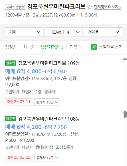 김포의 시세 상단을 결정하는 메트로자이의 최저호가는 6.5억부터 시작합니다. 위의 풍무센트럴푸르지오와 비슷하죠? 연식도 비슷합니다. 이제 세대교체를 해야할 때가 되었는데요. 메트로자이는 한강수자인오브센트와 북변 우미린이 그 자리를 물려받을 것입니다.