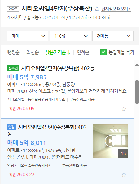 (3) 4단지(428세대, 2025년 1월 준공) : 5.79억(중/38층, 마피2000)