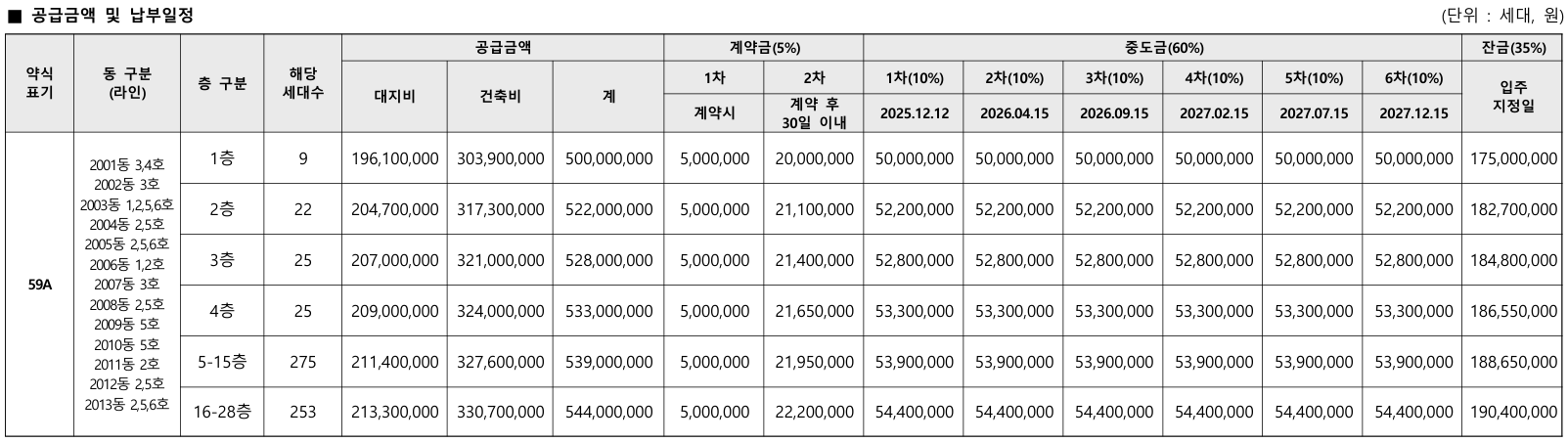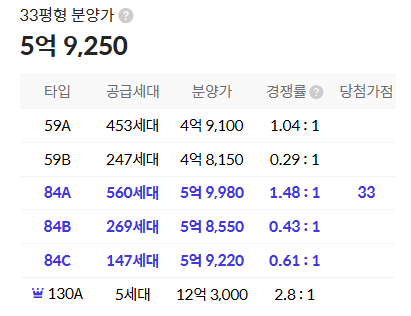 - 59A타입(609세대) : 5.44억