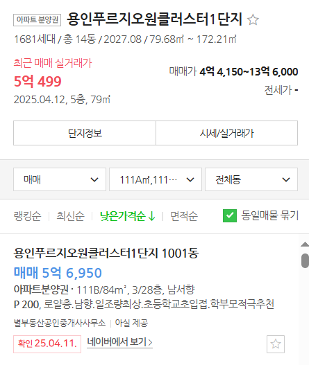 - 용인 푸르지오 원클러스터 1단지 (2027년 8월 준공, 1681세대)는 앞서 분양했던 단지로 전매제한이 풀려서 호가를 확인할 수 있습니다. 저층 매물과 고층 분양가라지만, 차이가 크네요. 안전마진은 없습니다.
