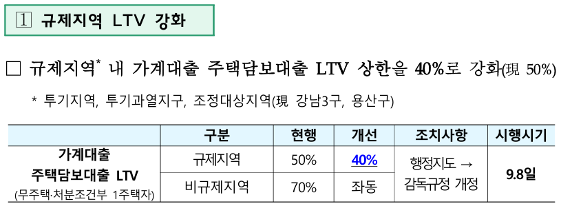 그리고, 대출입니다. 6.27 규제, 9.7 대책 이전에 모집공고는 나왔지만, 집단대출이 아니라 주택담보대출을 받아야합니다. 즉, 규제가 적용되는데요. 이제 LTV는 50%가 아니라 40%입니다. 게다가, 6.27 규제로 6억제한+처분+전입 조건이 붙습니다.