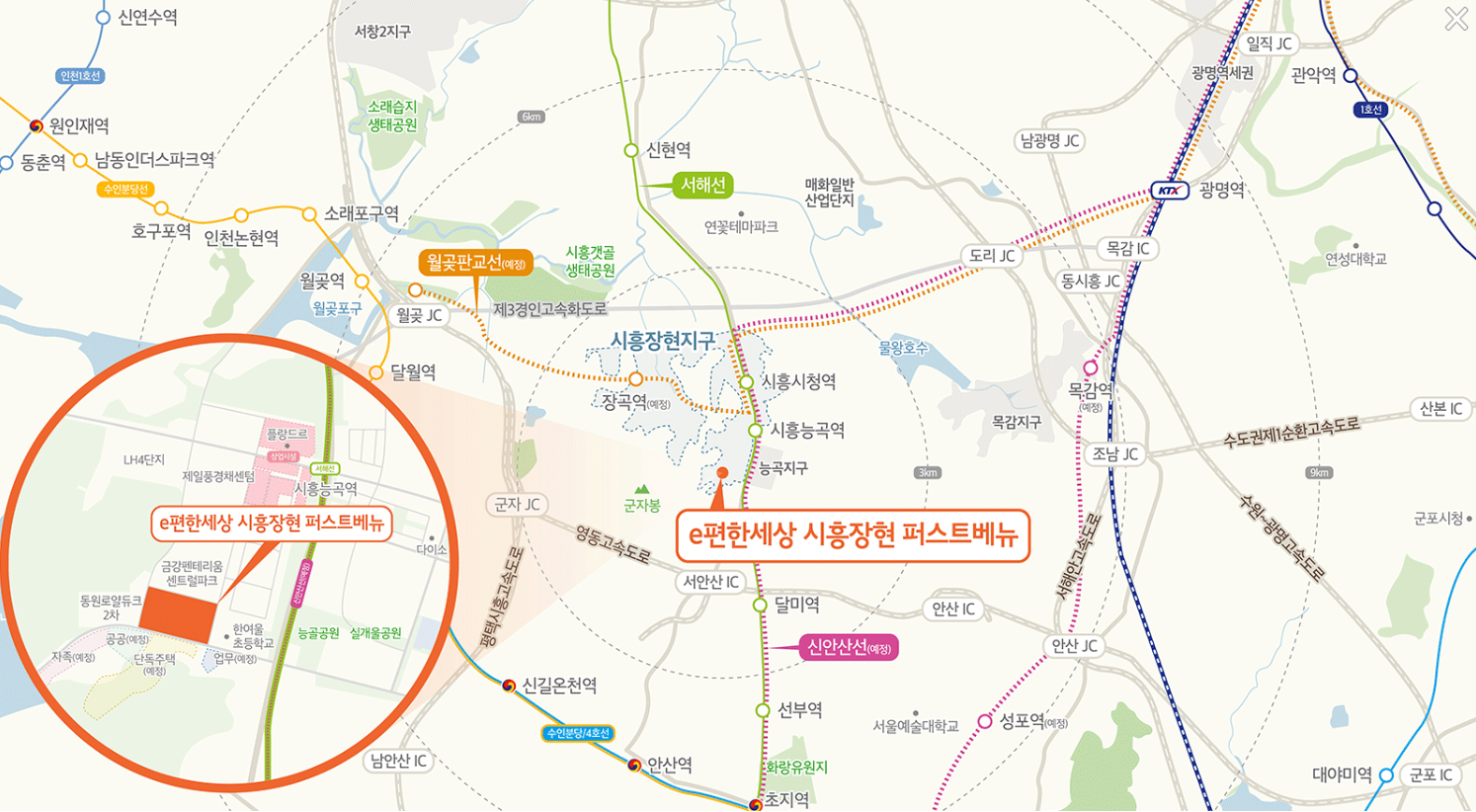 e편한세상 시흥장현 퍼스트베뉴는 초등학교를 품고있고, 신안산선 시흥능곡역을 도보로 이용할 수 있습니다. 월판선 시흥장곡역까지는 2km 내외의 거리입니다. 최초 분양 당시에는 신안산선은 2024년, 월판선은 2026년 개통예정이었으나, 2025년 4월 11일 광명시 일직동 일대의 붕괴사고 여파로 개통에 차질이 생겼습니다. 그래서, 덜 주목받고 있지만, 반경 2km에 이미 개통한 서해선을 포함해, 신안산선/월판선이 들어설 곳입니다. 그럼, 리뷰 시작하겠습니다.